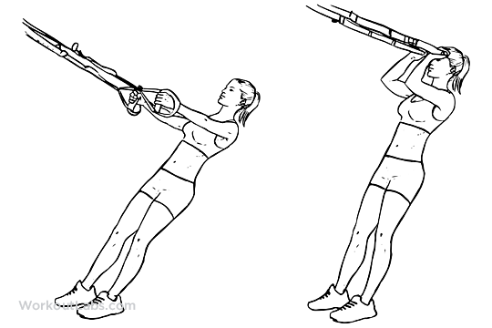 Sitúate de pie en frente del TRX, cógelo con ambas manos con los brazos extendidos hacia delante y las palmas giradas hacia arriba. Después inclina el cuerpo hacia atrás. Manteniendo estables los brazos, flexiona los codos tirando de tu cuerpo, aproximando las manos a los hombros, mientras sueltas aire.