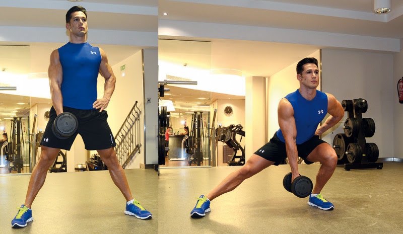Con una mancuerna en el brazo contralateral, desplaza el peso del cuerpo hacia una pierna, la carga desciende hacia la superficie muy cerca al pie de apoyo. Mantén la mirada al frente y el cuerpo lo más erguido posible para evitar que la columna se disponga muy inclinada.
